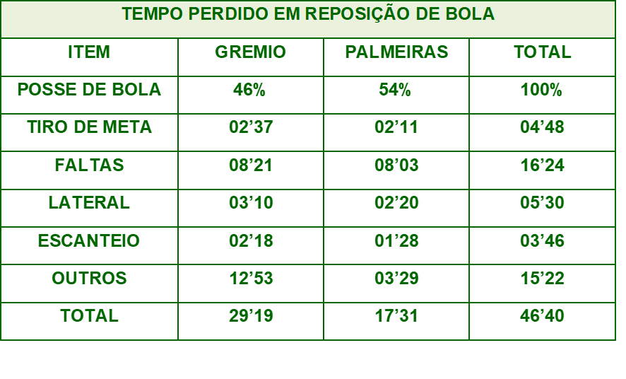 Acresceu três minutos no primeiro tempo, conforme o costume da arbitragem brasileira. No segundo tempo foi acrescido 7 minutos e postergado para 9 minutos. Foi um tempo muito curto, visto somente de consulta ao VAR foram consumidos quase 10 minutos, ainda tivemos atendimento médico, simulação de contusão, substituição, etc.
