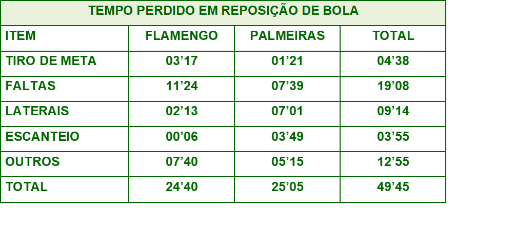 Acresceu oito minutos no primeiro tempo, pela demora na revisão do tiro penal e quatro no segundo tempo. No segundo tempo foi extremamente econômico, pelas substituições, jogadores caindo sem qualquer motivo aparente, conserto de aparelho de comunicação de árbitro assistente, etc.