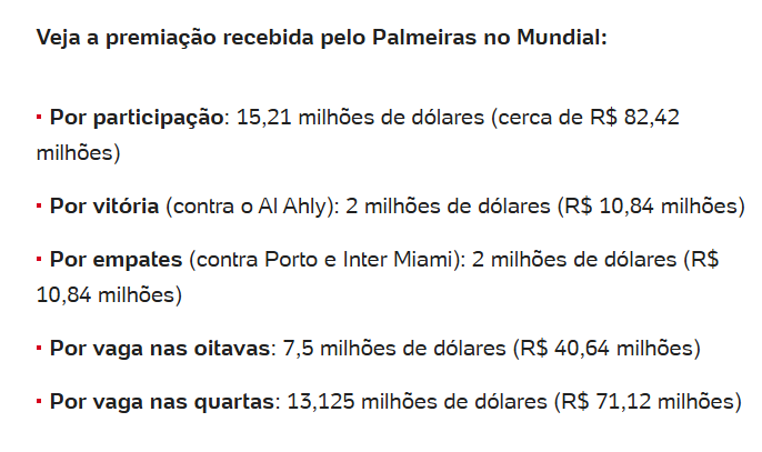 A premissa para definir qual colocação o Palmeiras chegará em cada torneio que disputará em 2026 define as premiações por campeonato (Direitos de Transmissão) e também as receitas de bilheterias (em mata mata, quanto mais longe se vai, mais partidas em casa faremos e portanto mais receitas teremos).