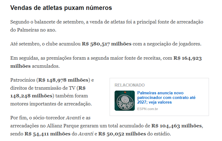 A receita acumulada em 2025 no período janeiro a setembro (9 meses) foi de R$ 1,4 BI. Em matéria publicada pela espn.com.br de 28/10/2025 havia uma expectativa em 2025 de receitas alcançando R$ 1,7 BI. É correto que em 2025 houve o Mundial Interclubes, que rendeu aos cofres alviverdes R$ 216 MM de acordo com o UOL (pedimos desculpas pela fonte).